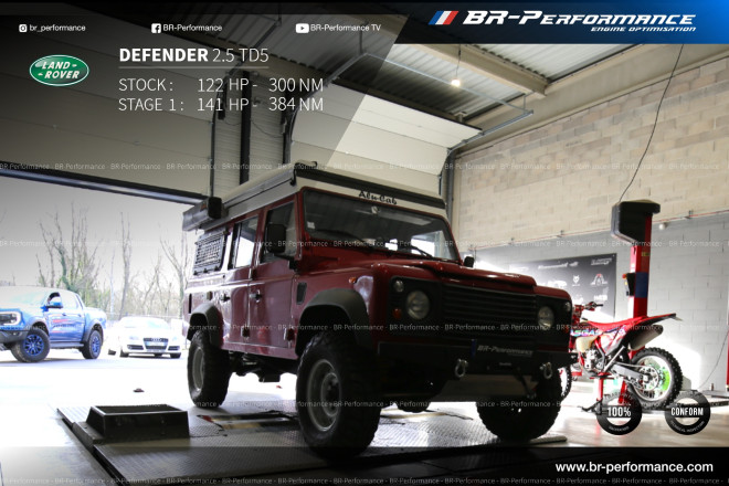 Je possède un Defender TD5 de 2002, le moteur avait 200 000km au compteur. Malgré l'âge du véhicule et le nombre de km je voulais quand même me faire un petit plaisir en le re-programment. BR-Performance mieux que je m'imaginais en le passant de 112,5 ch, 296,5 N.m à 156,5 ch et 363 N.m !!! Et tou cela en respectant le vieux moteur et la mécanique. Je vous recommande BR-Performance les yeux fermés!